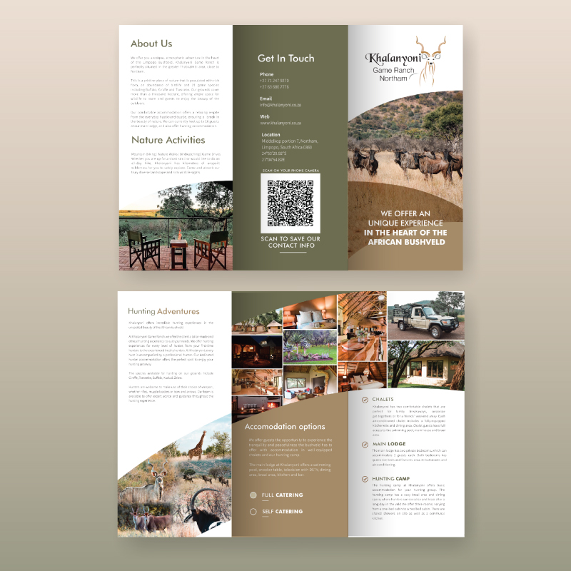 The flyer was designed for Khalanyoni Game Ranch that provides accommodation, hunting, game drives and so much more. This Game Ranch is exclusive for a corporate company that wanted these flyers to hand out to their clients in the corporate business.