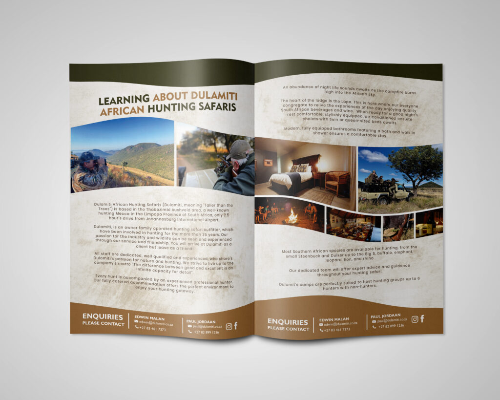 The flyer was created for Dulamiti that provides accommodation, hunting, activities and so much more. This hunting safaris is exclusive for overseas clients that want the African hunting experience with 5star accommodation, food etc. The purpose of the flyer is to hand it out at their expo’s overseas where they offer exclusive prices for any custom package you need.